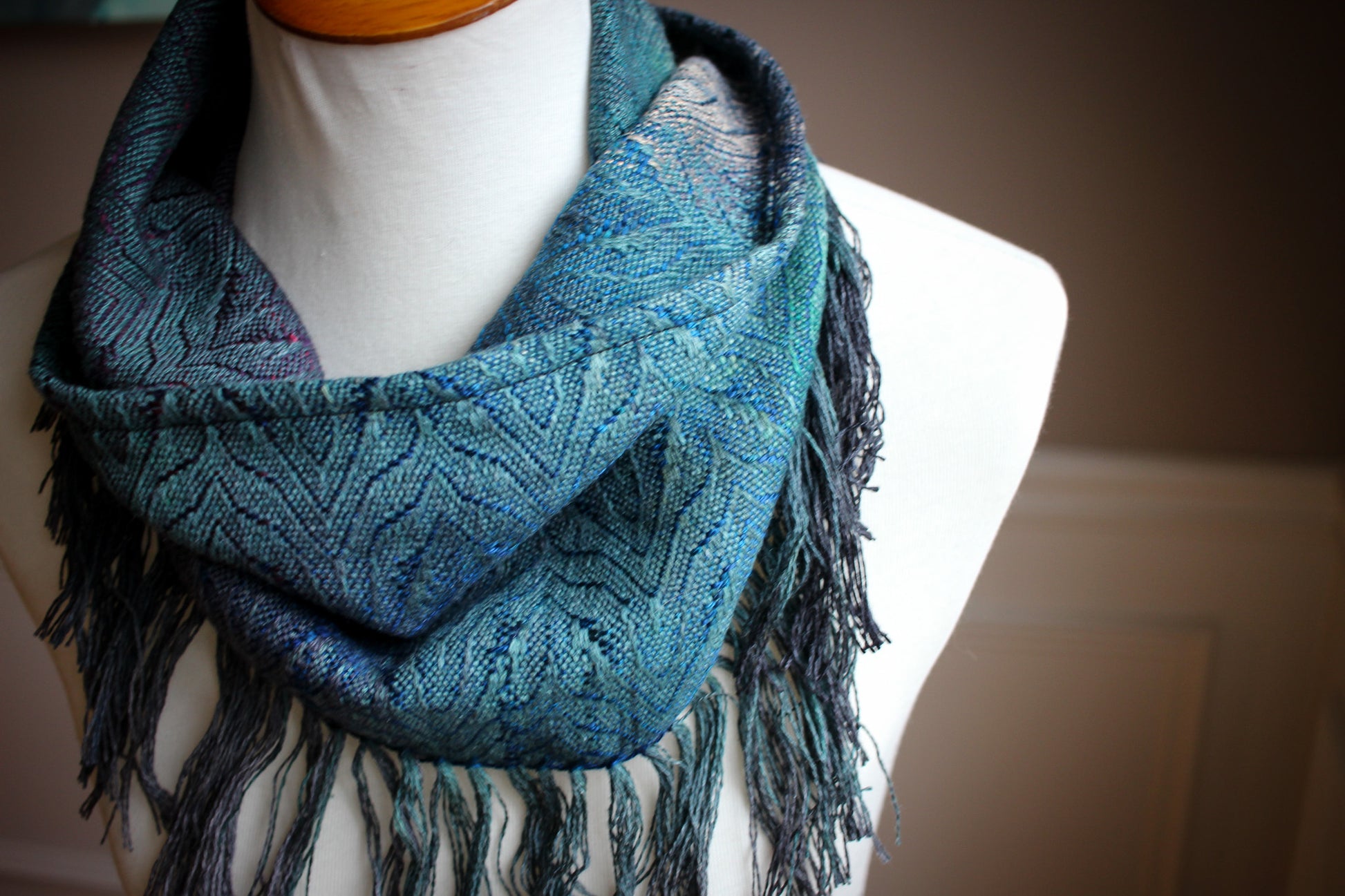 Ogenas is a 12/2nm 65% tussah/35% linen warp - this has a beautiful soft, flannely, smooshy texture! The weft on this piece is a slightly thicker 9.1/2nm Peruvian mulberry silk. The weft is dyed with color pooling in vibrant shades of emerald, sapphire & rich purple.