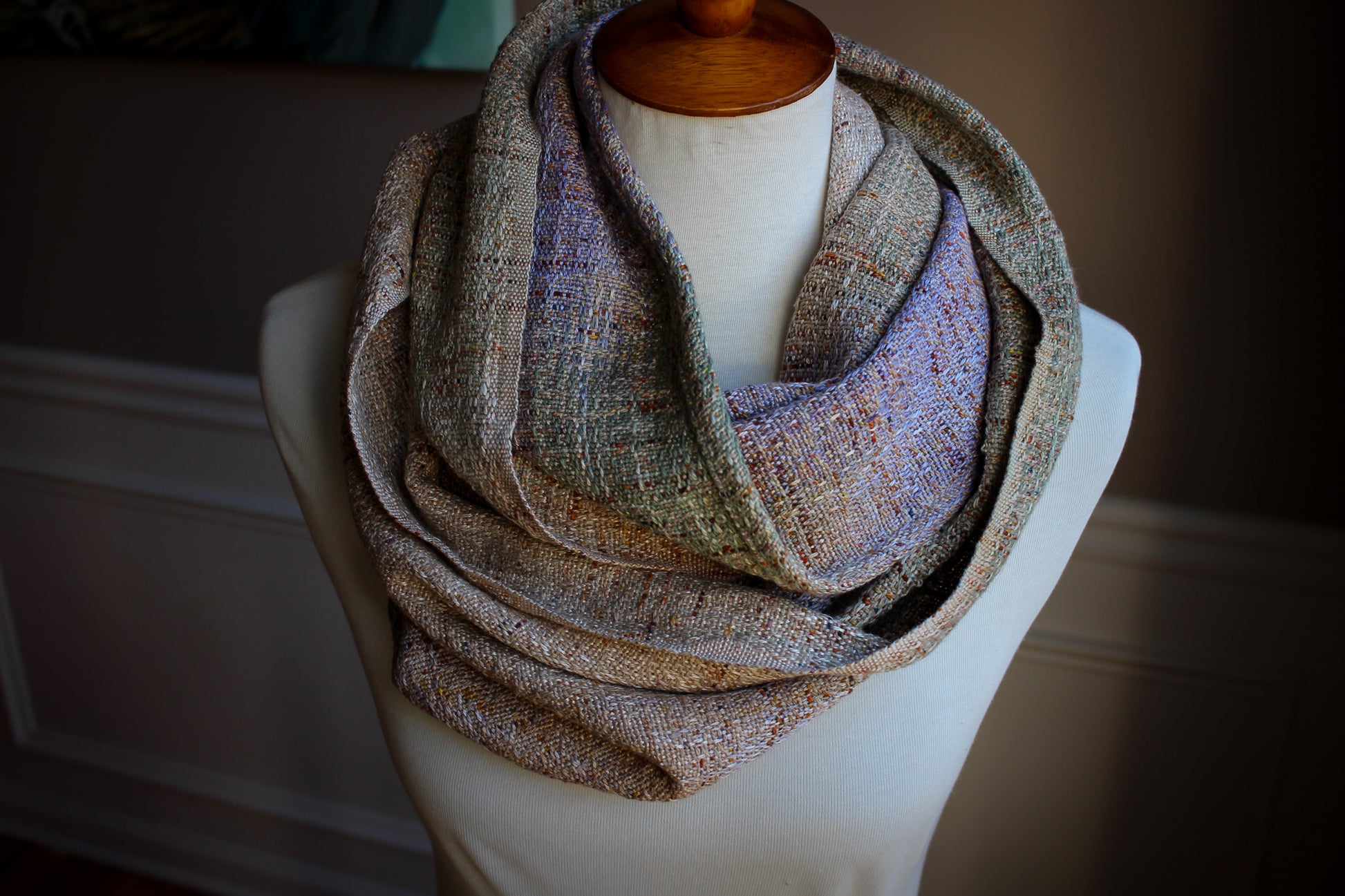 The warp fiber is 12/2nm thickness and is comprised of 2/3 of a 65% tussah silk 35% linen paired with 1/3 of a Peruvian mulberry silk, mixed throughout.