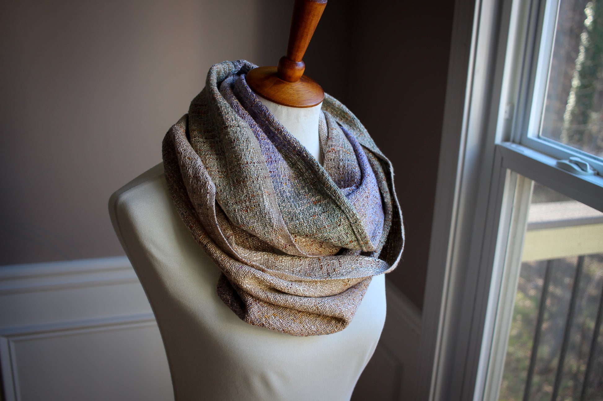This was a full width piece that was carefully shipped in half, with a hem running along the new edge. The original edge is the woven selvage. Once divided, this piece was sewn end to end - twice - making a super adjustable, easy to put on cowl.